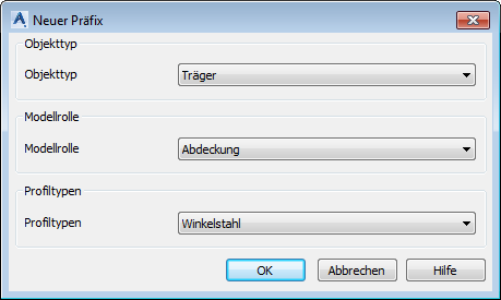 - Modellrolle: Die Modellrolle ist generisch (dieselbe Modellrolle kann sowohl Trägern als auch Blechen zugewiesen werden), in der Präfixregel wird eine Kombination beider ausgewählt (Objekttyp + Modellrolle).