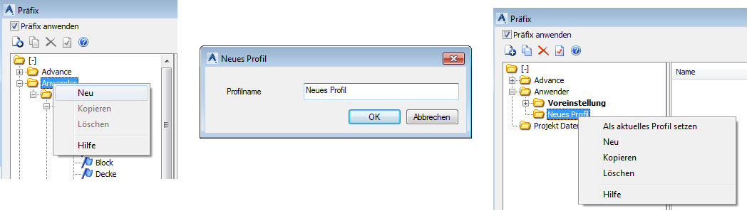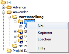 - Sie können ein neues Profil erstellen, indem Sie mit der rechten Maustaste auf den Kategorienamen (z. B. Anwender) klicken und Neu aus dem Kontextmenü auswählen.