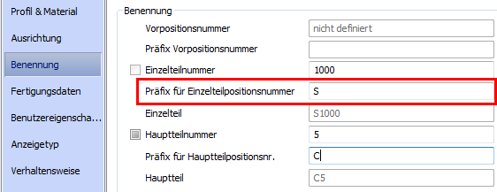 Sie können einen Textpräfix für Einzelteil- und Hauptteilnummern den Teilenummern separat voranstellen.