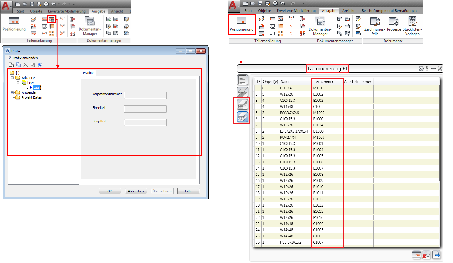 Präfixprofile sind entsprechend den Elementen gruppiert, für die sie definiert wurden (Träger, Bleche, Kantbleche, Sonderteile).