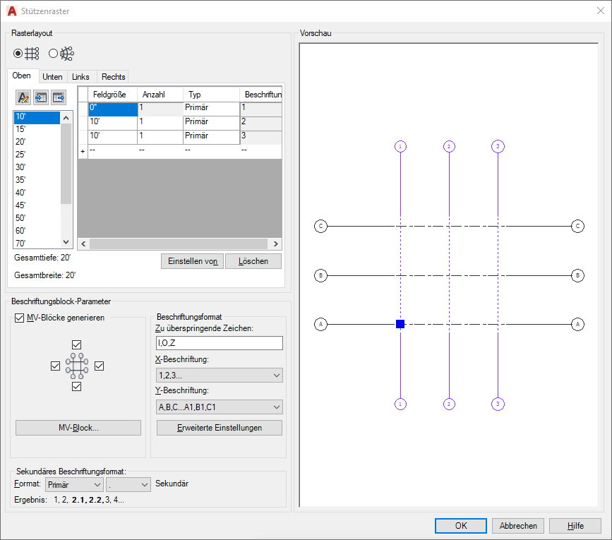 • Werden nachfolgende Rasterlinien hinzugefügt, werden die Beschriftungen entsprechend der Formatierung für MV-Blöcke generieren erstellt.