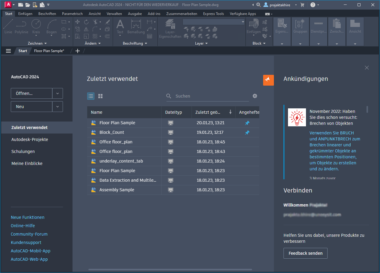 Die Registerkarte Start wird standardmäßig beim Start angezeigt. Sie bietet einfachen Zugriff auf eine Reihe von anfänglichen Aktionen, darunter Zugriff auf Zeichnungsvorlagendateien, zuletzt geöffnete Zeichnungen und Plansätze, Online- und Lernoptionen sowie Ankündigungen.