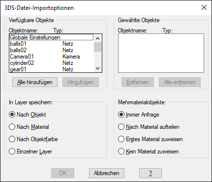 Zeigt die Namen aller Objekte in der angegebenen 3D Studio (3DS)-Datei an. Sie können bis zu 70 Objekte auswählen.