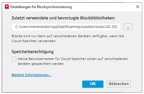 Steuert die Berechtigung zum Speichern des Benutzernamens für den Cloud-Speicher für alle Geräte. Die Auswahl dieser Option bietet geräteübergreifend ein individuelleres Benutzererlebnis beim Zugriff auf die zuletzt verwendeten und bevorzugten Blöcke.
