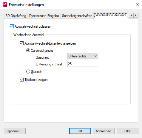 Steuert, ob die Funktion zum Wechseln der Auswahl aktiviert ist. (Systemvariable SELECTIONCYCLING)