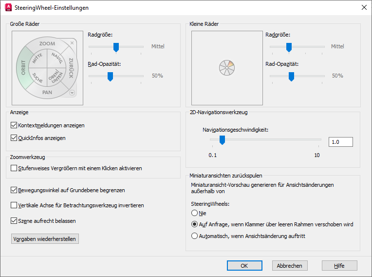 Optionen (Befehl), Finden: > SteeringWheelsauf der Registerkarte 3D-Modellierung