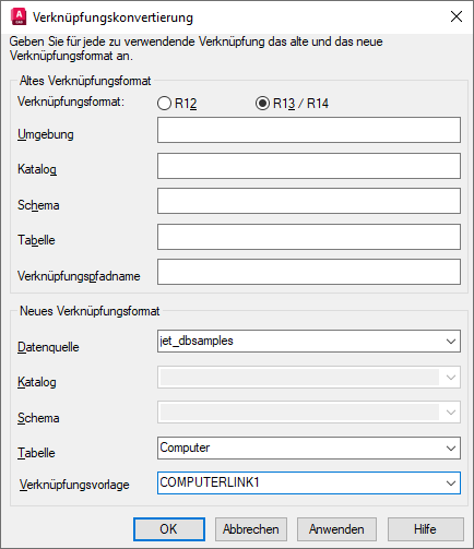 Format der zu konvertierenden Verknüpfung. Für R12 und R13/R14 werden verschiedene Felder angezeigt.