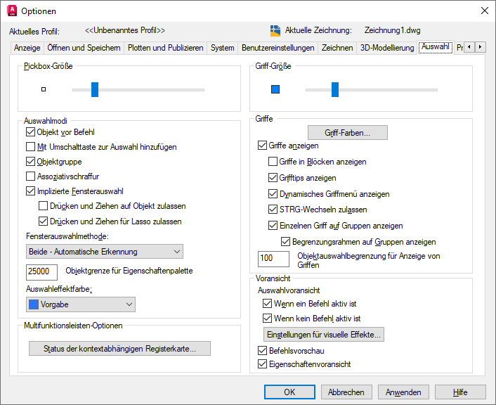Zeigt die Auswahlvorschau an, wenn keine Befehle aktiv sind. (Systemvariable SELECTIONPREVIEW)
