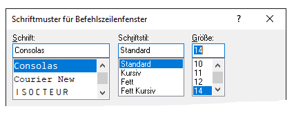 Ändern Sie im Dialogfeld Schriftmuster für Befehlszeilenfenster die Schriftart, den Schriftstil und die Größenoptionen für den Text, der in den Befehls- und Textfenstern angezeigt wird.