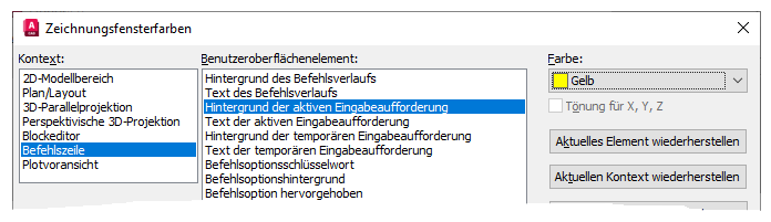 Wählen Sie im Dialogfeld Zeichnungsfensterfarben unter Kontext die Option Befehlszeile.