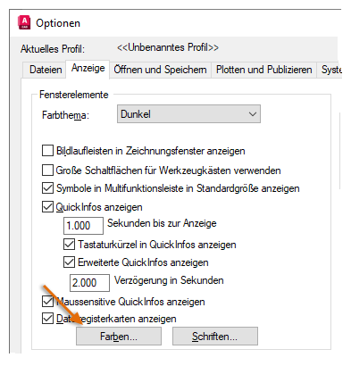 Klicken Sie im Dialogfeld Optionen auf der Registerkarte Anzeige unter Fensterelemente auf Farben.