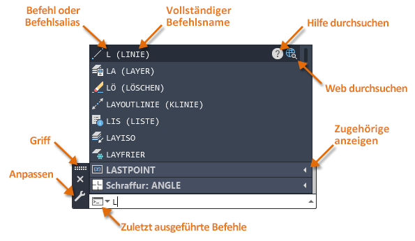 Wenn Sie die Eingabe beginnen, in diesem Beispiel den Buchstaben L, werden die verfügbaren Befehle und Systemvariablen in einer Liste angezeigt. Bei dieser Funktion handelt es sich um die Auto-Vervollständigung. Anschließend können Sie den Befehl oder die Systemvariable auswählen, den/die Sie verwenden möchten.