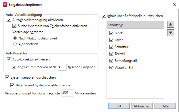 Steuert die Einstellungen für die Anzeige der Befehlszeilen-Vorschlagsliste für Befehle, Systemvariablen und benannte Objekte.