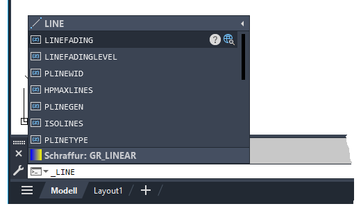 Nach einer kurzen Verzögerung wird die Vorschlagsliste für die Auto-Vervollständigung angezeigt. Sie wird basierend auf dem eingegebenen Text gefiltert. Befehle und Befehlsaliasse, die mit dem eingegebenen Text übereinstimmen, werden oben in der Liste angezeigt, während Systemvariablen unter dem ersten erweiterbaren Abschnitt gruppiert werden. Übereinstimmende Schraffurmuster und benannte Objekte werden in anderen erweiterbaren Abschnitten bei den Systemvariablen angezeigt.