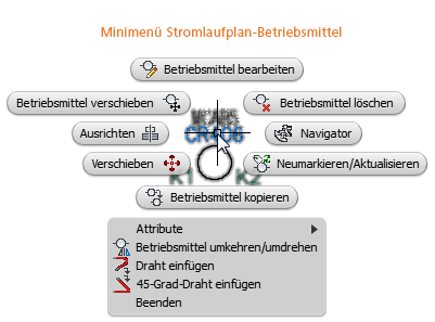 Vergewissern Sie sich, dass der aktuelle Arbeitsbereich auf AcadE 2D-Zeichnung und Beschriftung gesetzt ist. Das Minimenü ist ein kreisförmig angeordnetes Kontextmenü. Verschieben Sie den Cursor auf ein Electrical-Objekt, und klicken Sie mit der rechten Maustaste. Die Optionen des daraufhin angezeigten Kontextmenüs sind abhängig von der Art des mit dem Cursor ausgewählten Objekts.