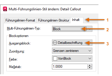 Zum Erstellen eines detaillierten Beschriftungsstils starten Sie beispielsweise den Befehl MFÜHRUNGSSTIL. Klicken Sie im Stilmanager für Multi-Führungslinien auf Neu, und wählen Sie einen beschreibenden Namen für den neuen Multi-Führungslinienstil. Klicken Sie auf die Registerkarte Inhalt, wählen Sie Block und anschließend Detailbeschriftung, wie in der Abbildung gezeigt.