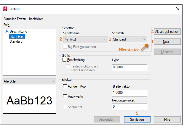 Wenn Sie einen neuen Textstil erstellen, geben Sie zuerst einen Namen an und wählen dann eine Schrift und einen Schriftstil. Die Reihenfolge, in der Sie auf die Schaltflächen klicken sollten, wird in der folgenden Abbildung gezeigt: