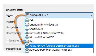 Wählen Sie in der Dropdown-Liste Drucker/Plotter AutoCAD PDF (General Documentation).pc3: