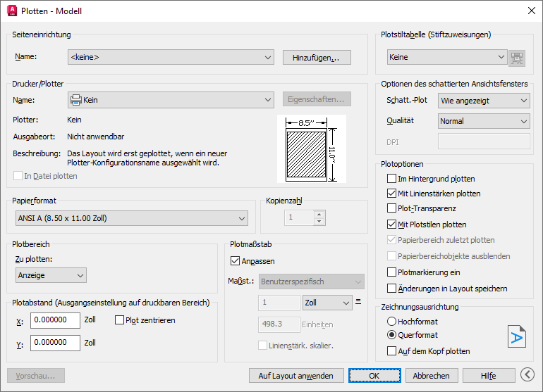 Geben Sie ein Zeichnungslayout an einen Drucker, Plotter oder eine Datei aus. Speichern und Wiederherstellen der Druckereinstellungen für jedes Layout.