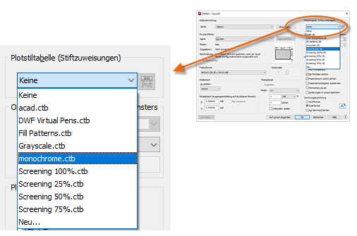 Die Plotstiltabelle enthält Informationen zur Verarbeitung von Farben. Farben, die zwar auf dem Monitor optimal angezeigt werden, sind möglicherweise nicht für PDF-Dateien oder zum Drucken geeignet. Möglicherweise möchten Sie eine farbige Zeichnung, jedoch eine monochrome Ausgabe erstellen. So legen Sie eine monochrome Ausgabe fest: