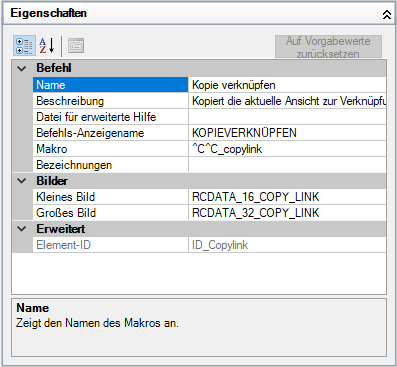 Die Tilde (~) und das Ausrufezeichen, gefolgt von einem Punkt (!.), werden vor die Befehlsbeschriftung Kopie verknüpfen (Eigenschaft Name des Bereichs Eigenschaften) gesetzt. Es folgt eine Darstellung des Befehls Kopie verknüpfen, der im Menü Bearbeiten markiert und grau abgeblendet ist.