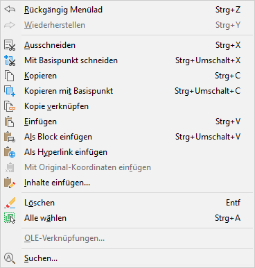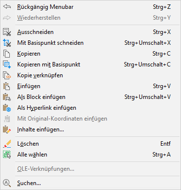 Das folgende Beispiel zeigt das Menüelement OLE-Verknüpfungen im Menü Bearbeiten, das durch ein Häkchen markiert ist, sowie das Bild des Menüelements Kopie verknüpfen, das durch einen Rand hervorgehoben ist.