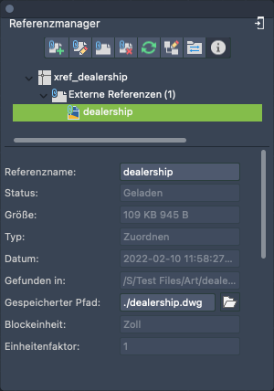 Die Referenzmanager-Palette enthält einen Werkzeugkasten am oberen Rand. Sie können mit der rechten Maustaste auf die Dateiliste klicken, um ein Kontextmenü anzuzeigen, mit dem Sie eine angehängte externe Referenz anhängen oder verwalten können. Klicken Sie auf die Schaltfläche Details anzeigen in der Symbolleiste, um Details und Miniaturansichten der ausgewählten externen Referenz anzuzeigen.