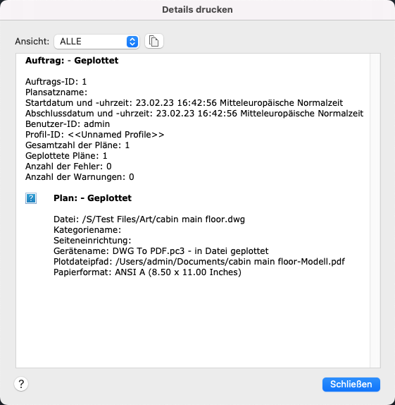 Zeigt Informationen zu Plot- und Publizieraufträgen an, die in der aktuellen Sitzung abgeschlossen wurden.