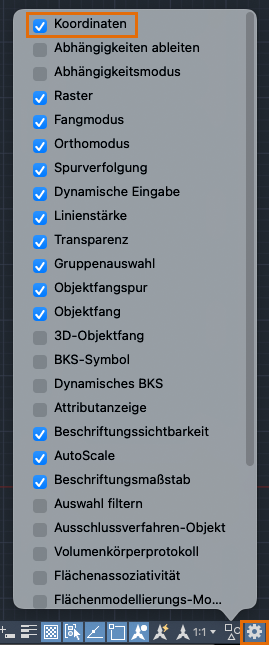 Anmerkung: Wenn in der Statusleiste keine Koordinaten angezeigt werden, wählen Sie in den Statusleisteneinstellungen die Option Koordinaten aus.