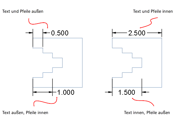 Bemaßungstext und Pfeilspitzen werden in der Regel zwischen den Hilfslinien angezeigt, wenn dort genug Platz zur Verfügung steht. Reicht der vorhandene Platz nicht aus, können Sie festlegen, wie diese Elemente platziert werden.