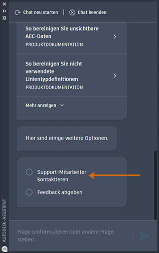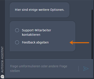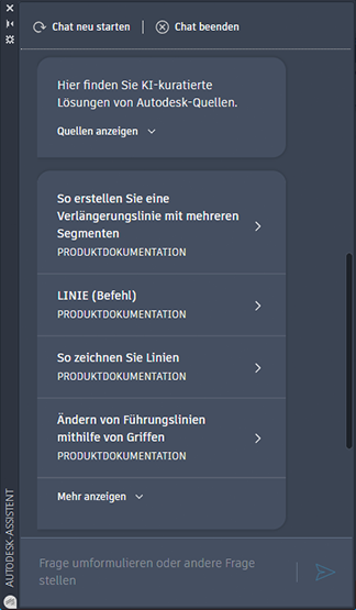 Zeigt die Palette Autodesk-Assistent an, in der Sie nach Hilfe aus verschiedenen Quellen suchen, den Support kontaktieren oder Feedback geben können. Suchergebnisse werden durch maschinelles Lernen unterstützt.