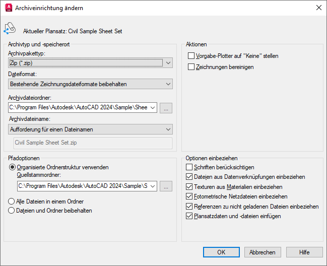 Ändert die Pfade, die Vorgabeformate, die Organisation und andere Einstellungen für einen archivierten Plansatz.