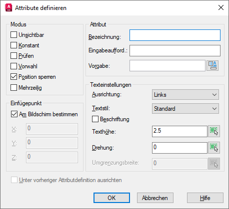 Die Vorgabewerte werden in der Systemvariable AFLAGS gespeichert. Eine Änderung der Einstellungen für AFLAGS wirkt sich auf den Vorgabemodus für neue Attributdefinitionen aus und nicht auf vorhandene Attributdefinitionen.