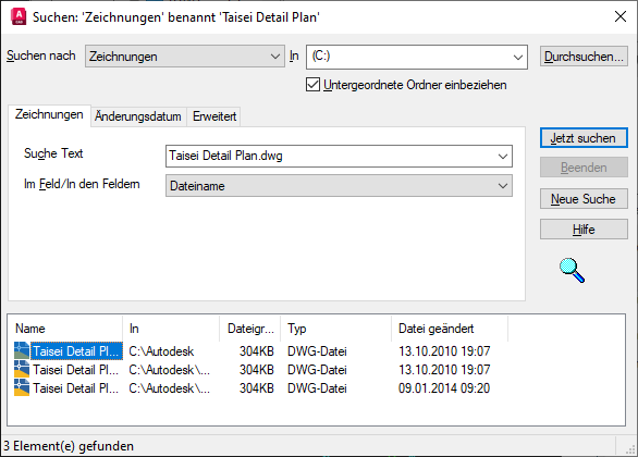 Sucht nach Inhalten wie Zeichnungen, Schraffurmustern und Blöcken.