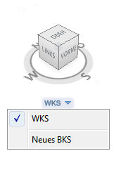 Im Menü BKS unterhalb des ViewCube wird der Name des aktuellen BKS im Modell angezeigt. Über das Menü können Sie eines der benannten, mit dem Modell gespeicherten BKS wiederherstellen, zu WKS wechseln oder ein neues BKS definieren. Mit der WKS-Option im Menü können Sie das Koordinatensystem vom aktuellen BKS zu WKS umschalten. Mit dem neuen BKS können Sie das aktuelle BKS basierend auf einem, zwei oder drei Punkten drehen, um ein neues BKS zu definieren. Wenn Sie auf Neues BKS klicken, wird ein neues BKS mit dem Vorgabenamen Unbenannt erstellt. Um das neu definierte BKS unter einem Namen zu speichern, verwenden Sie im Befehl BKS die Option Benannt.