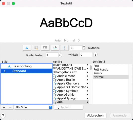 Wenn Sie einen Namen aus der Liste auswählen, wird die Datei für diese Schrift eingelesen. Die Zeichendefinitionen der Datei werden automatisch geladen, wenn die Datei nicht bereits von einem anderen Textstil verwendet wird. Es können mehrere Stile für dieselbe Schrift definiert werden.