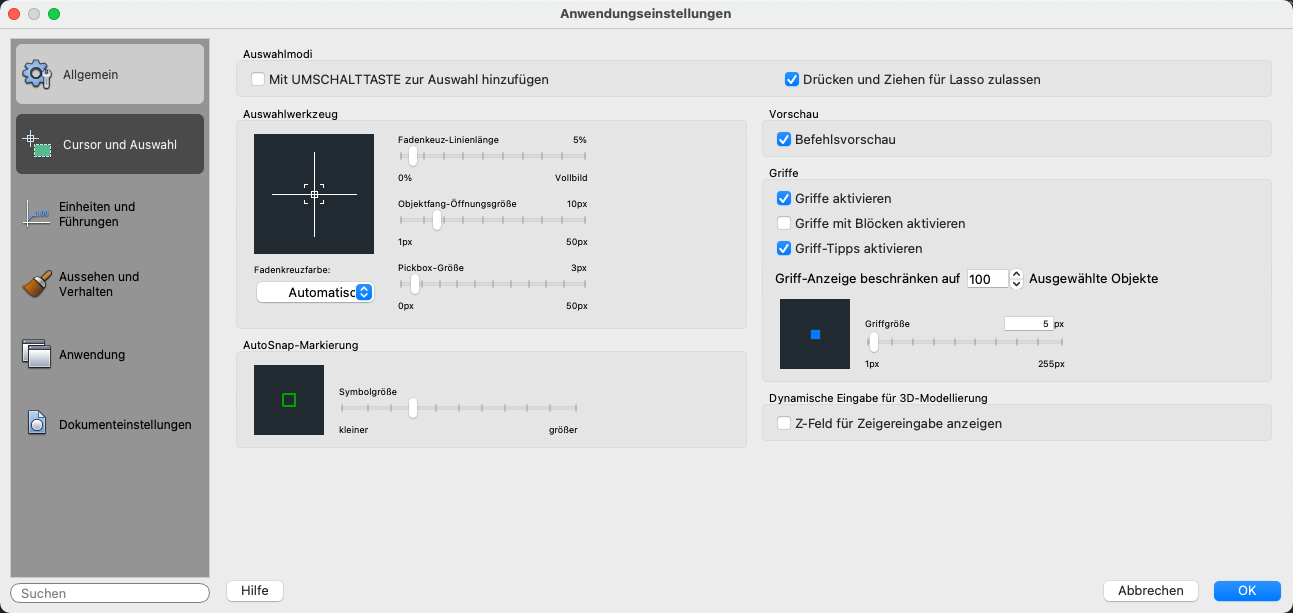 Registerkarte Cursor und Auswahl (Dialogfeld Anwendungseinstellungen)