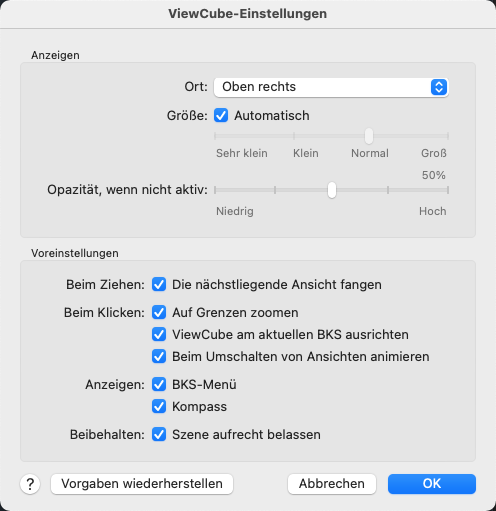 Wendet die Standardeinstellungen für das ViewCube-Werkzeug an.