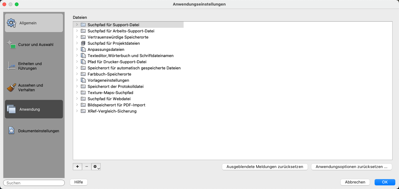 Führt die Ordner auf, in denen das Programm nach Support-, Treiber-, Menü- und anderen Dateien sucht. Darüber hinaus werden einige optionale, benutzerdefinierte Einstellungen aufgeführt, beispielsweise das Wörterbuch für die Rechtschreibprüfung.