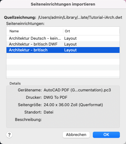 Zeigt die Quellzeichnung an, die eine Liste der für den Import verfügbaren Seiteneinrichtungen enthält.
