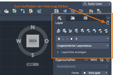 Um zu sehen, wie eine Zeichnung organisiert ist, verwenden Sie die Layer-Palette. Die Layer-Palette ist vorgabemäßig auf der rechten Seite über der Eigenschaftsprüfung fixiert. Heben Sie die Fixierung der Palette auf, um die Größe der Palette und der einzelnen Spalten in der Palette zu ändern.