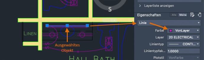 Beachten Sie, dass die aktuellen Eigenschaften des ausgewählten Objekts in der Palette angezeigt werden. Sie können jede dieser Eigenschaften ändern, indem Sie darauf klicken und die betreffende Einstellung ändern. Eine Eigenschaft, die auf VonLayer eingestellt ist, übernimmt die Einstellung vom Layer. Im vorherigen Beispiel sind die Objekte, die auf dem Layer 20 ELECTRICAL erstellt wurden, violett, da dies die vorgegebene Farbe der Objekte auf diesem Layer ist.
