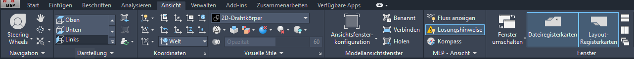 - MEP - Ansicht. Bietet Werkzeuge zum Anzeigen der Flussrichtung von Luftkanälen/-rohren und Rohren, einen Befehl zum Anzeigen unterbrochener Verbindungen (Lösungshinweise) und eine Methode zum Anpassen der Kompasseinstellungen. Die erweiterte Registerkarte bietet eine Methode zum Ausblenden der Kompassleiste und ein Werkzeug zum Steuern der Größe der Lösungshinweise.