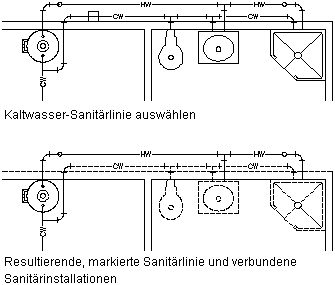 Es werden alle Sanitärlinien, Formstücke und Sanitärobjekte markiert, die mit der Sanitärlinie verbunden sind und in Fallrichtung davon liegen, wie in der folgenden Abbildung dargestellt.