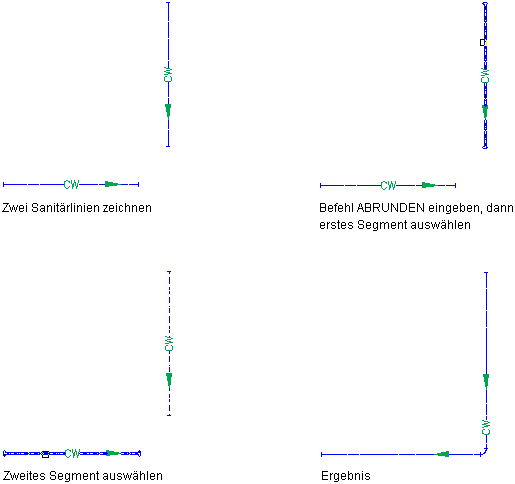 Der Befehl ABRUNDEN rundet die Ecken von Objekten ab. Wenn Sie diesen Befehl zum Verbinden zweier Objekte verwenden und den Abrundungsradius auf Null einstellen, stutzt oder dehnt der Befehl die Objekte, bis sie sich schneiden, erstellt jedoch keinen Bogen.
