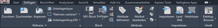 Die Registerkarte Einfügen ermöglicht das Arbeiten mit Referenzen, Blöcken, MV-Blöcken, Attributen sowie Inhalten aus externen Katalogen wie dem Katalog-Browser und Autodesk Seek.