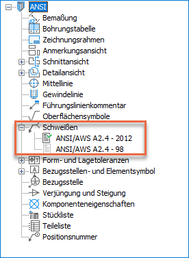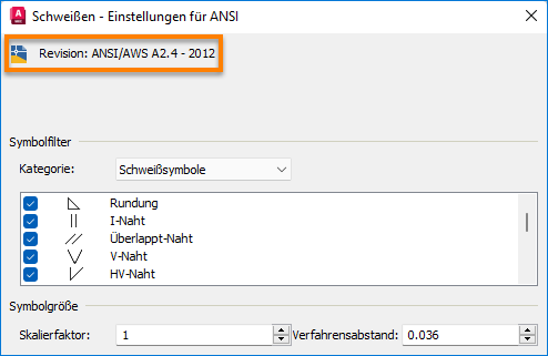Im Dialogfeld Schweißen wird die neueste ANSI-Revision angezeigt. Die entsprechenden Schweiß- und Nahtausführungssymbole werden auch im Symbolfilter aufgeführt.