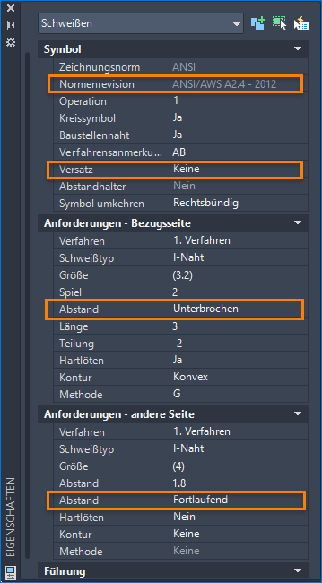 Sie können alle Schweißsymboleigenschaften in der Eigenschaftenpalette anzeigen und ändern.