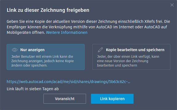 Geben Sie einen Link zu einer Kopie der aktuellen Zeichnung frei, um sie in AutoCAD im Internet oder auf Mobilgeräten anzuzeigen oder zu bearbeiten. Alle zugehörigen DWG-XRefs und Bilder werden eingeschlossen.