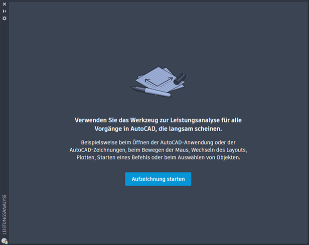 LEISTANALYSE – Öffnet die Palette Leistungsanalyse, mit der Sie Vorgänge in AutoCAD analysieren können, die langsam oder gar nicht zu reagieren scheinen.